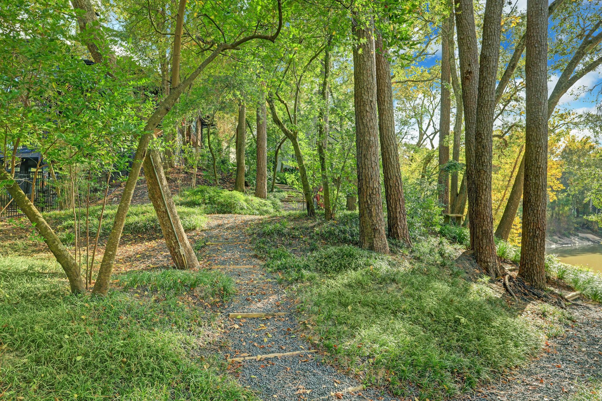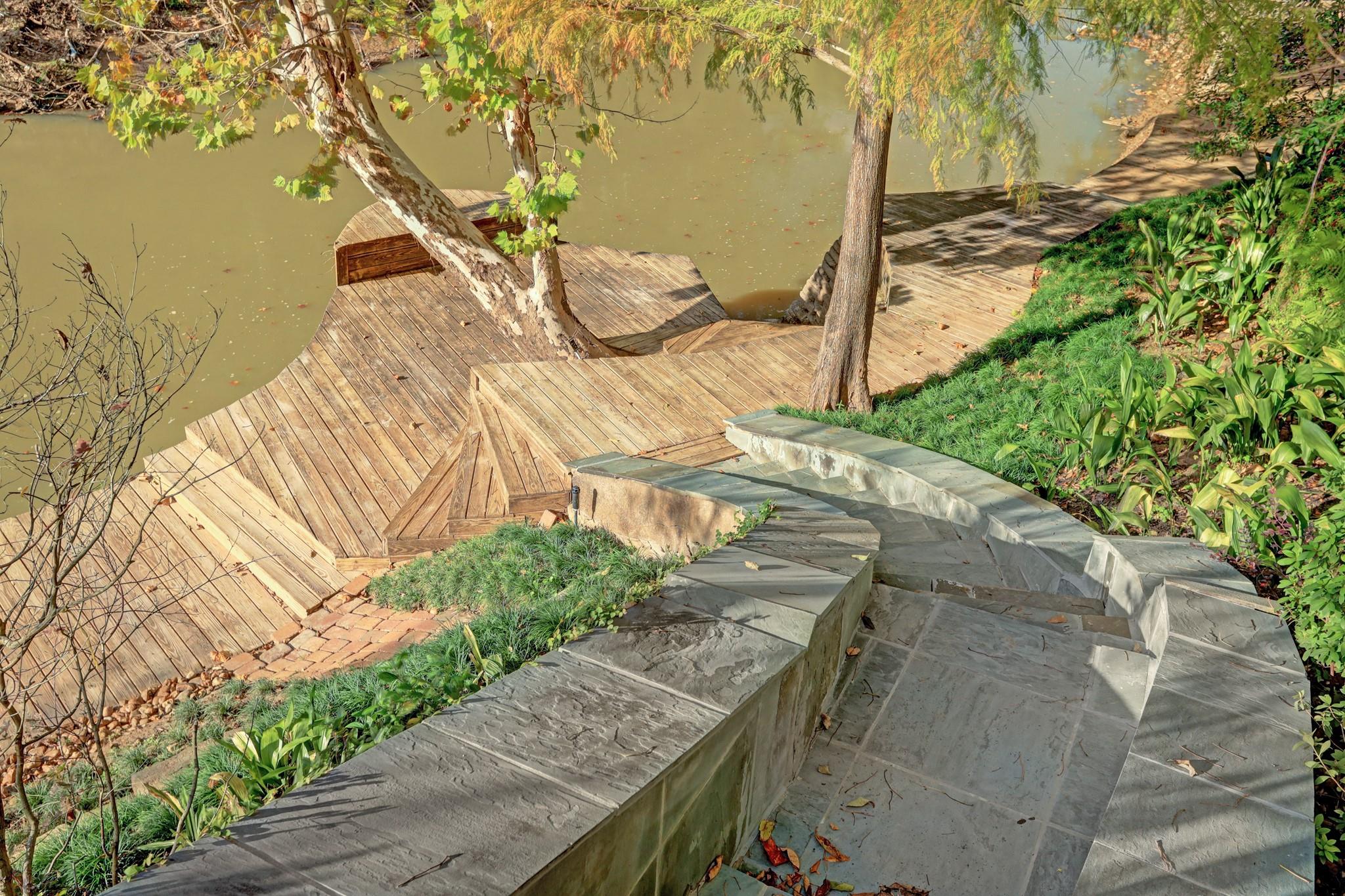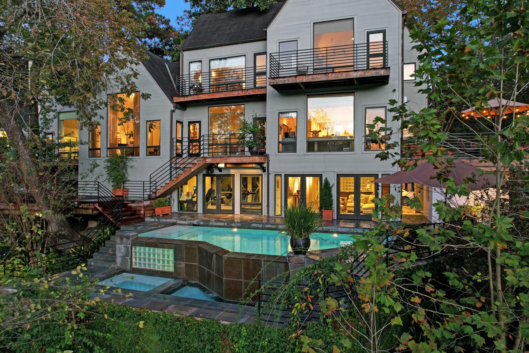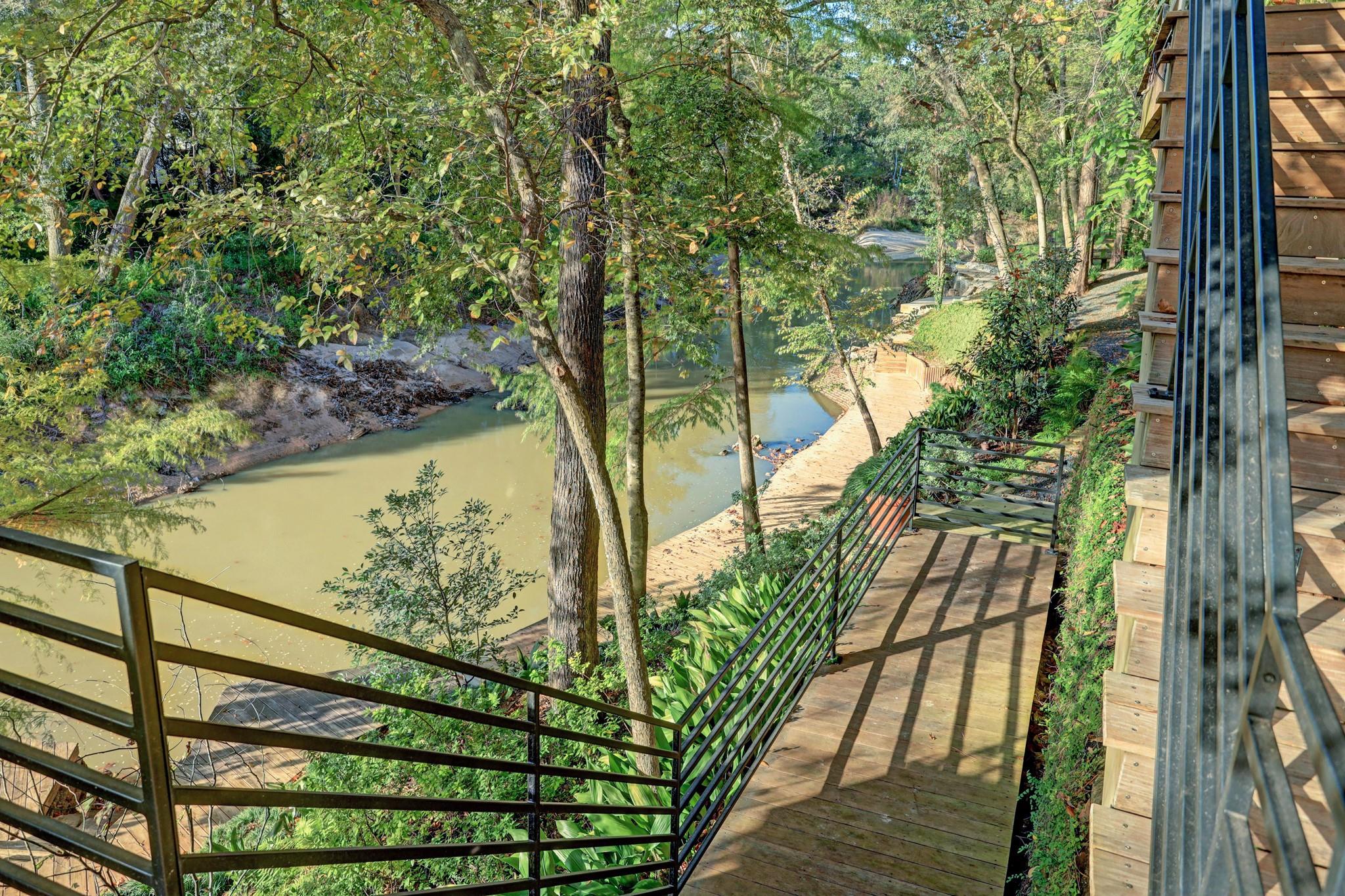 Perched on a wooded bluff above Buffalo Bayou, this stunning residence, crafted by the late Howard Barnstone, is a masterclass in Postmodernist architecture. The multi-gabled home offers sweeping bayou vistas, dramatic pitched ceilings, and open-air atriums that harmonize with the lush, landscaped grounds. The main floor is meticulously designed to cater to the owner's every need, featuring the primary suite and living/dining areas on the same level. The custom kitchen is adorned with Poggenpohl cabinetry and stainless steel appliances. The primary suite is luxuriously appointed with a marble-clad bathroom, two spacious closets, and direct access to outdoor decks. Upstairs, the secondary bedrooms boast en-suite bathrooms and private deck access. The lower level is an entertainer's dream, complete with a wet bar, game room, and a 3-car garage. The rear grounds are a haven of tranquility, featuring wooden decks, walkways, gravel trails, and an infinity-edge pool overlooking the bayou.