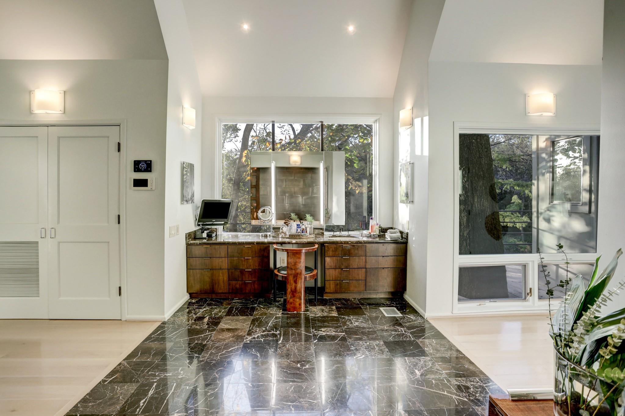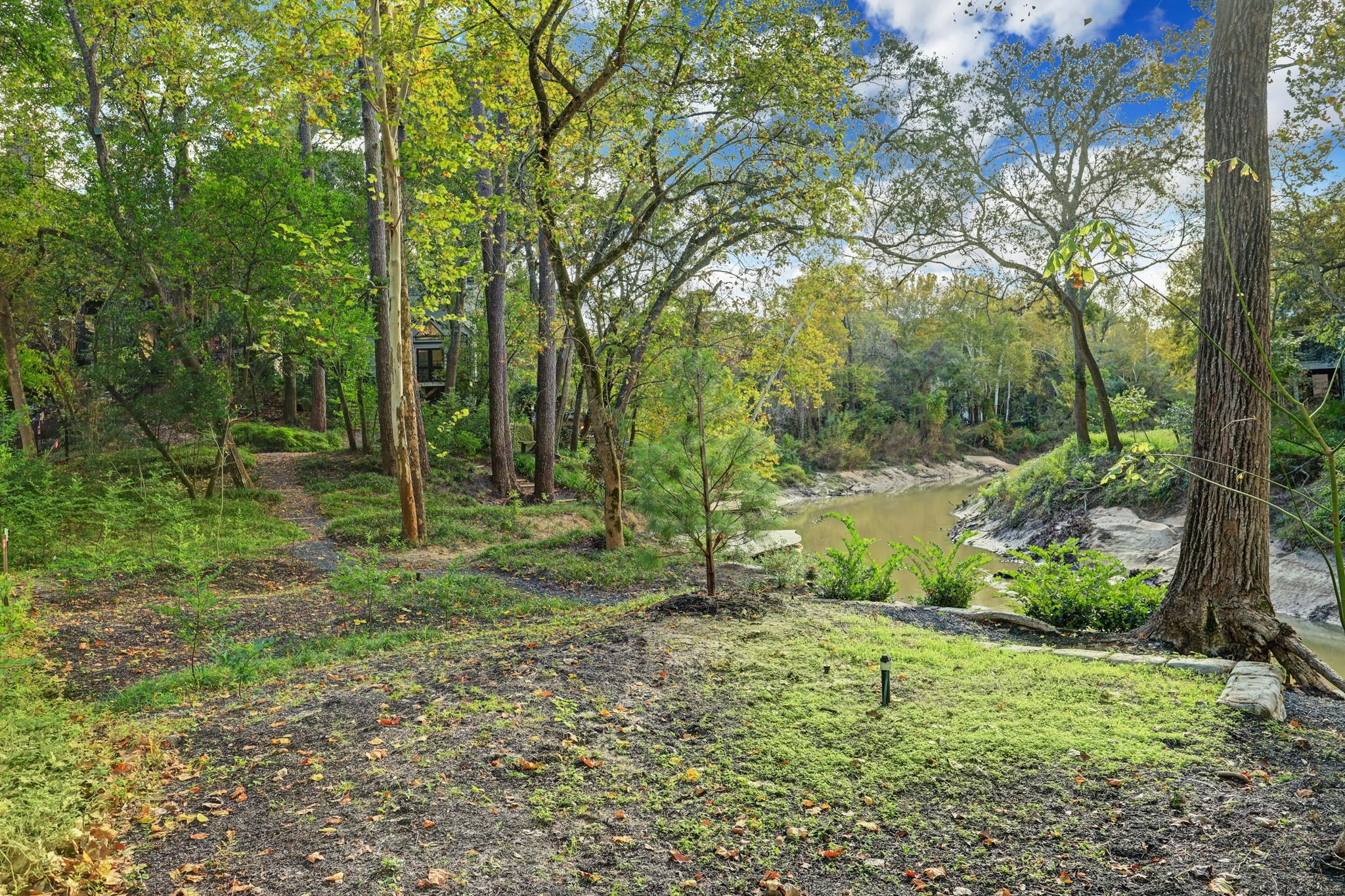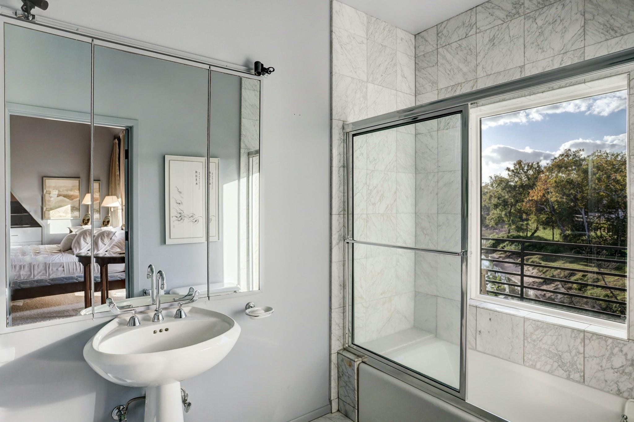Perched on a wooded bluff above Buffalo Bayou, this stunning residence, crafted by the late Howard Barnstone, is a masterclass in Postmodernist architecture. The multi-gabled home offers sweeping bayou vistas, dramatic pitched ceilings, and open-air atriums that harmonize with the lush, landscaped grounds. The main floor is meticulously designed to cater to the owner's every need, featuring the primary suite and living/dining areas on the same level. The custom kitchen is adorned with Poggenpohl cabinetry and stainless steel appliances. The primary suite is luxuriously appointed with a marble-clad bathroom, two spacious closets, and direct access to outdoor decks. Upstairs, the secondary bedrooms boast en-suite bathrooms and private deck access. The lower level is an entertainer's dream, complete with a wet bar, game room, and a 3-car garage. The rear grounds are a haven of tranquility, featuring wooden decks, walkways, gravel trails, and an infinity-edge pool overlooking the bayou.