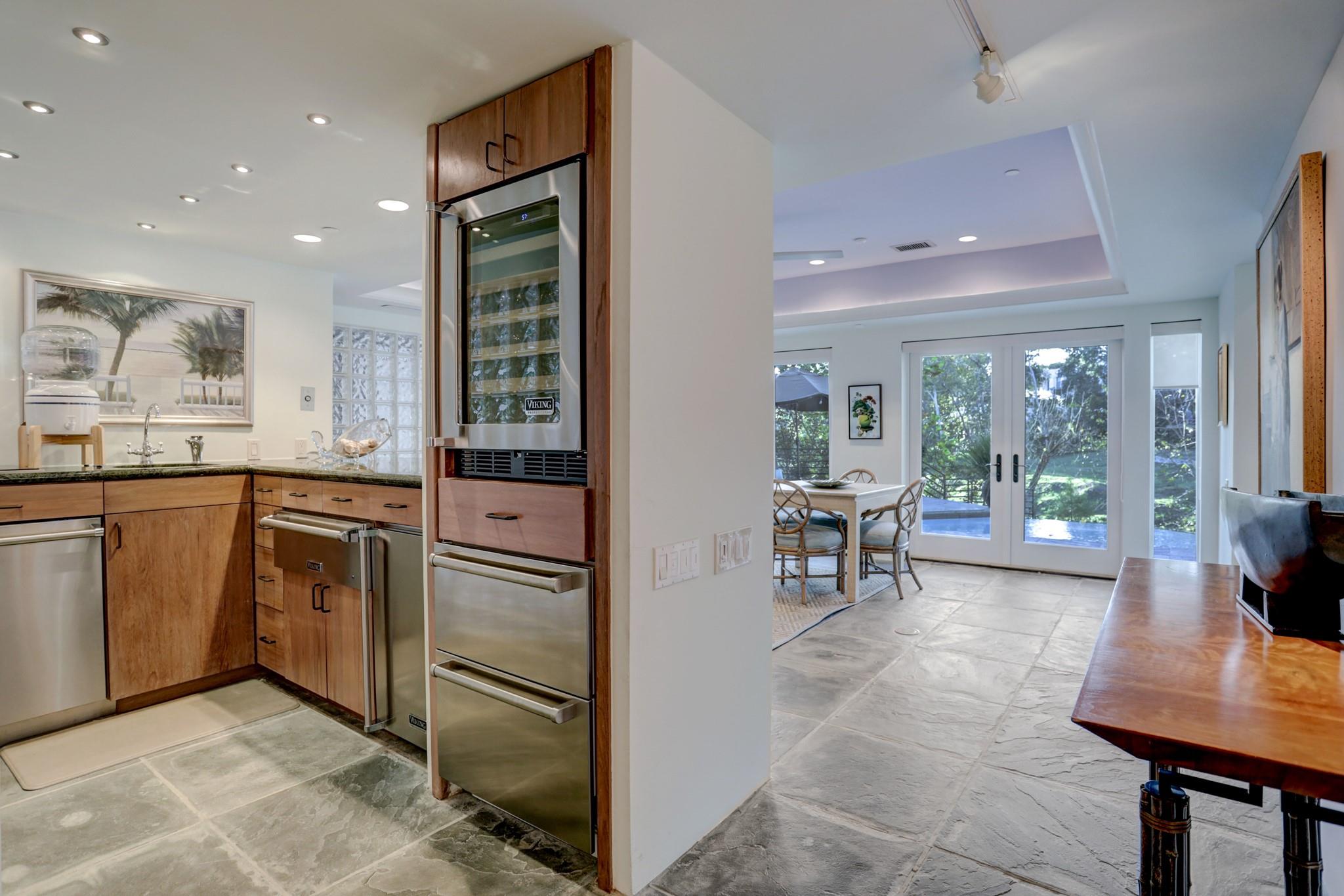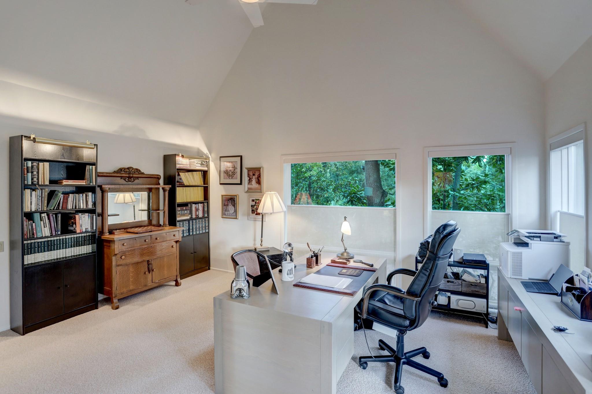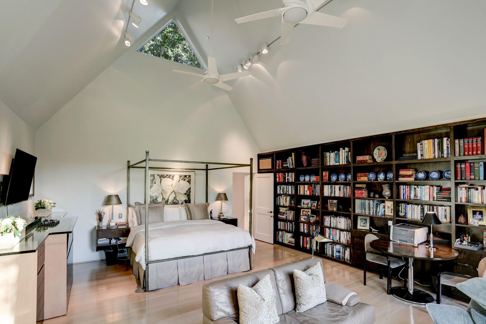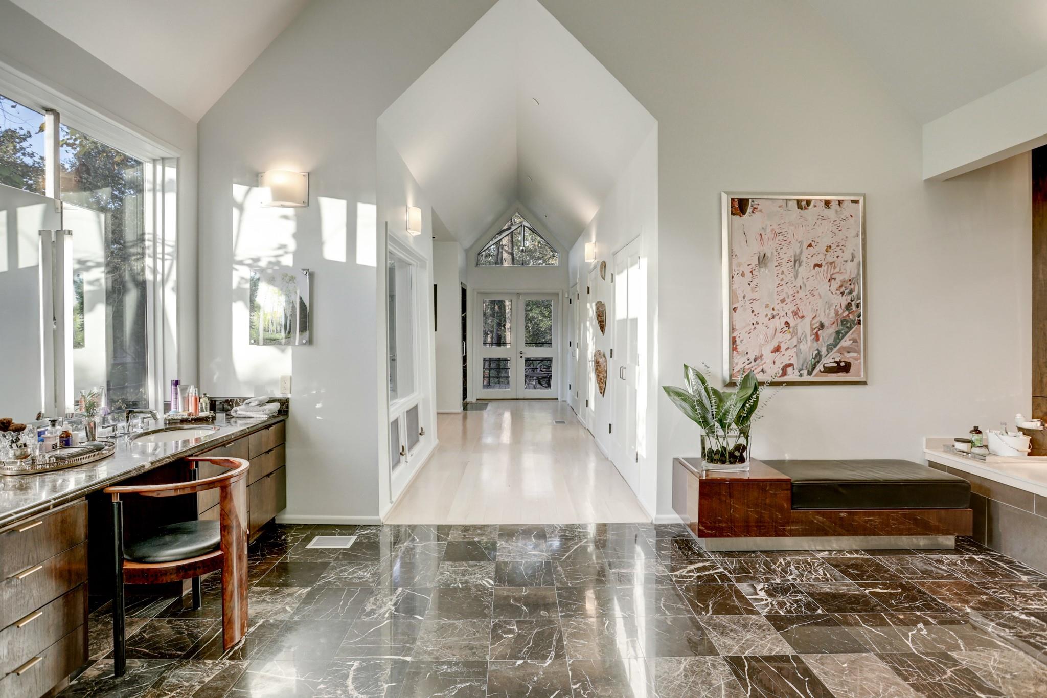 Perched on a wooded bluff above Buffalo Bayou, this stunning residence, crafted by the late Howard Barnstone, is a masterclass in Postmodernist architecture. The multi-gabled home offers sweeping bayou vistas, dramatic pitched ceilings, and open-air atriums that harmonize with the lush, landscaped grounds. The main floor is meticulously designed to cater to the owner's every need, featuring the primary suite and living/dining areas on the same level. The custom kitchen is adorned with Poggenpohl cabinetry and stainless steel appliances. The primary suite is luxuriously appointed with a marble-clad bathroom, two spacious closets, and direct access to outdoor decks. Upstairs, the secondary bedrooms boast en-suite bathrooms and private deck access. The lower level is an entertainer's dream, complete with a wet bar, game room, and a 3-car garage. The rear grounds are a haven of tranquility, featuring wooden decks, walkways, gravel trails, and an infinity-edge pool overlooking the bayou.