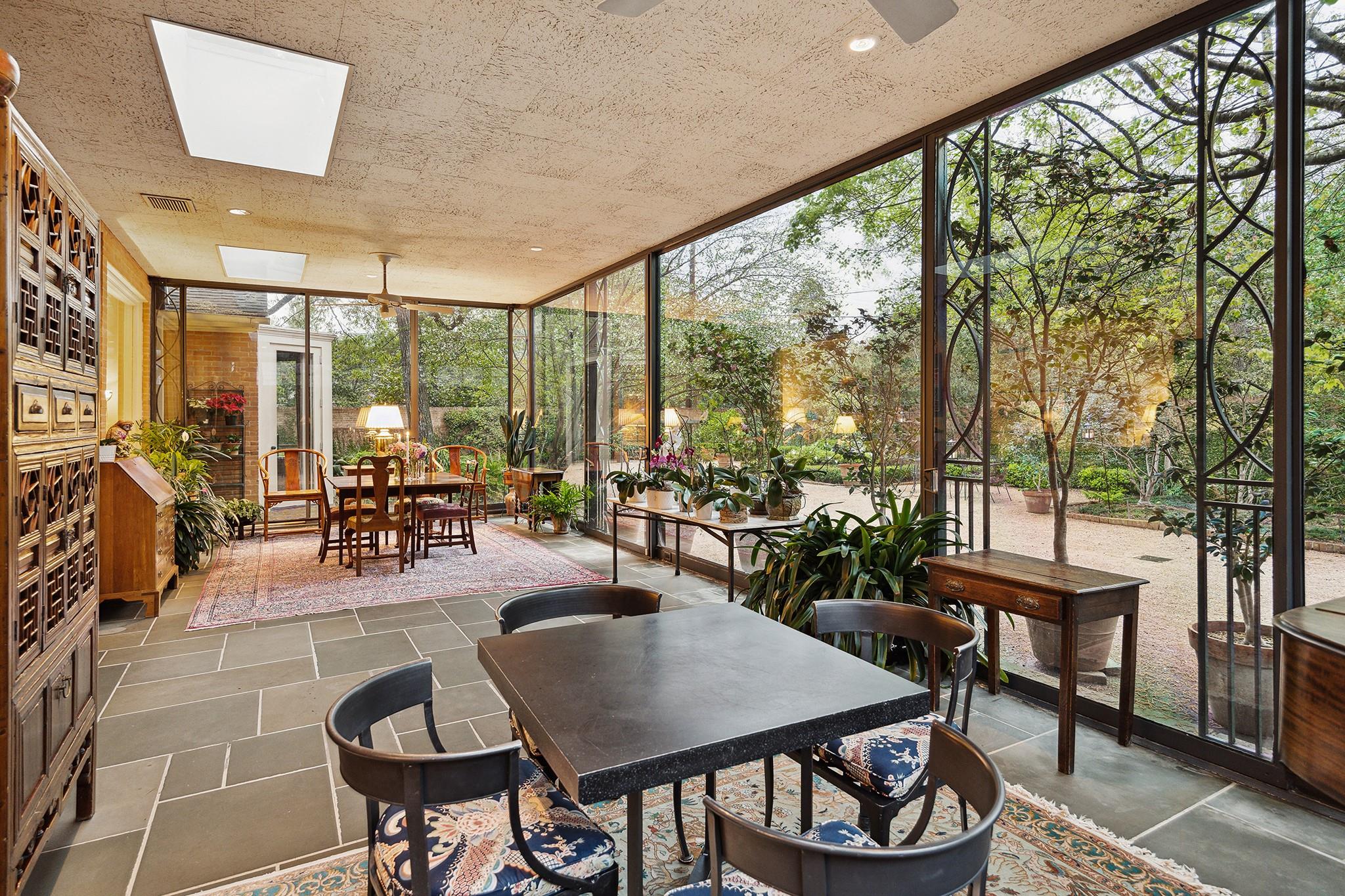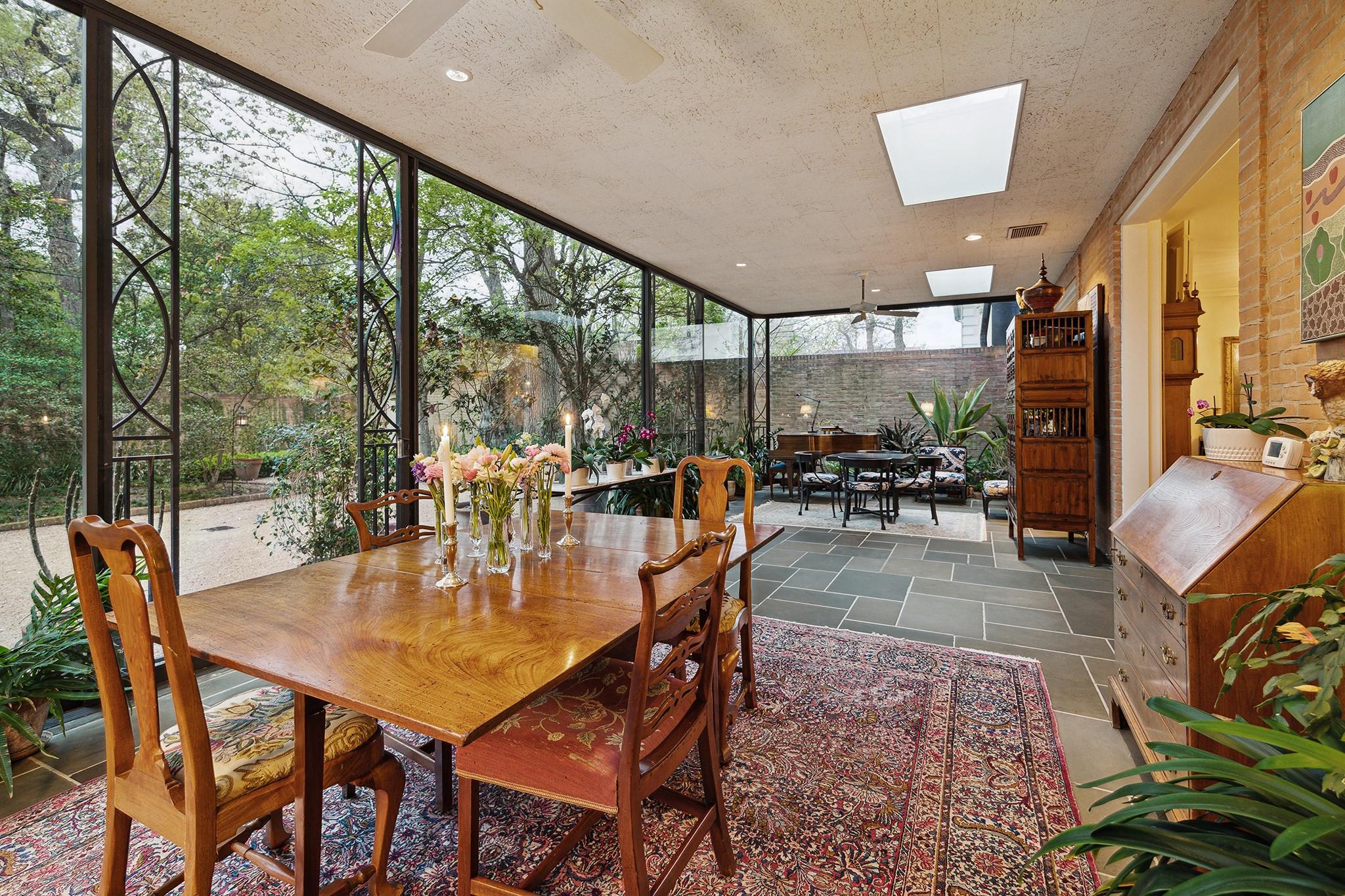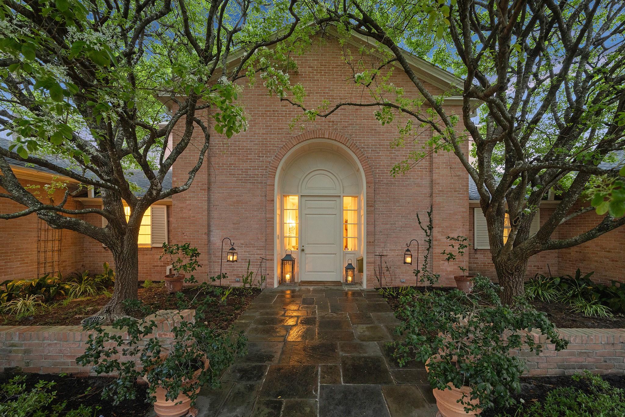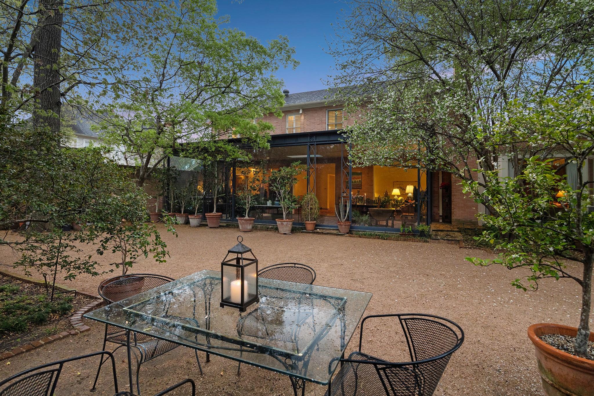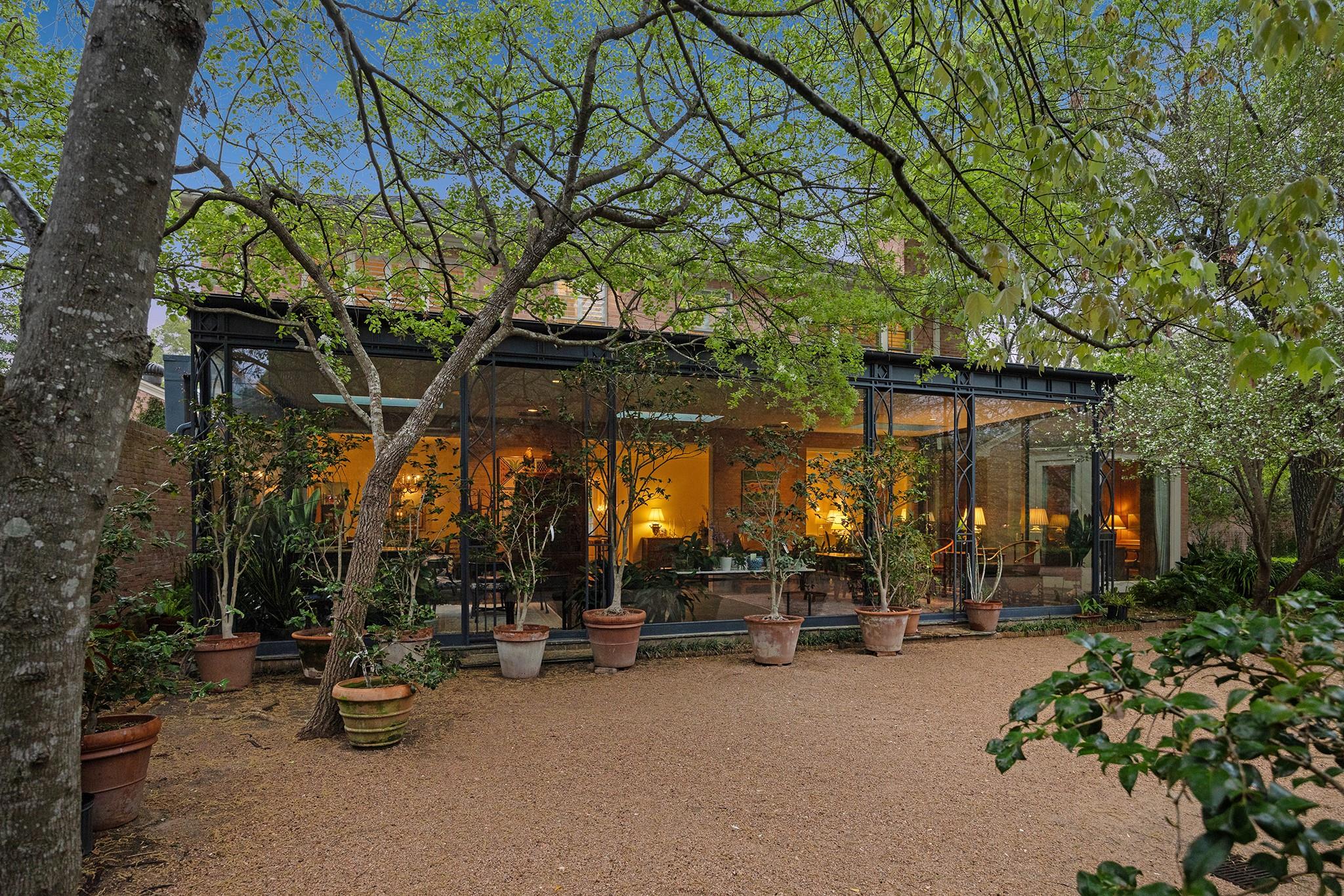 This River Oaks Mid Century Modern gem by renowned architect John F. Staub exudes timeless elegance. The expansive 19,095 sq. ft. corner lot (per HCAD) offers a welcoming parking court and lush private gardens. Lovingly restored and thoughtfully updated, this home blends classic charm with modern comforts. The open formal living and dining areas flow into a light-filled sunroom overlooking the gardens. A gracious wood-paneled study, complete with a cozy fireplace and bay window, adds sophistication. Notable features include stationary floor-to-ceiling picture windows, rich hardwood floors, solid bifold doors, and an imported marble fireplace. The first-floor primary suite is a true retreat, featuring a coffered ceiling, serene garden views, lavish dual full baths, and custom-fitted closets. Two secondary bedrooms with ensuite baths upstairs. The property backs onto the park-like gardens of the historic DeMenil House.