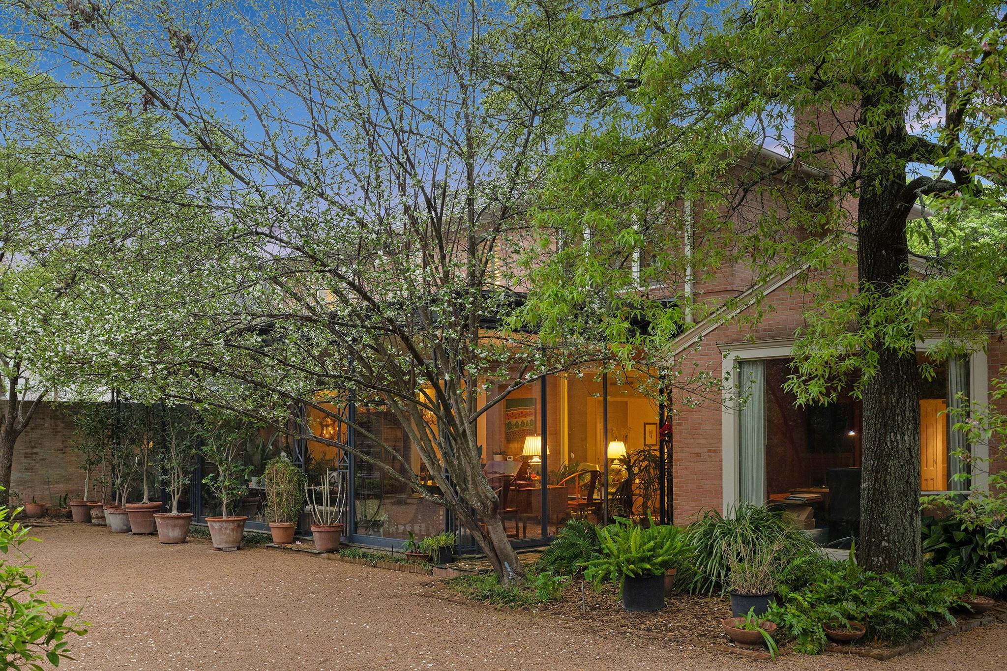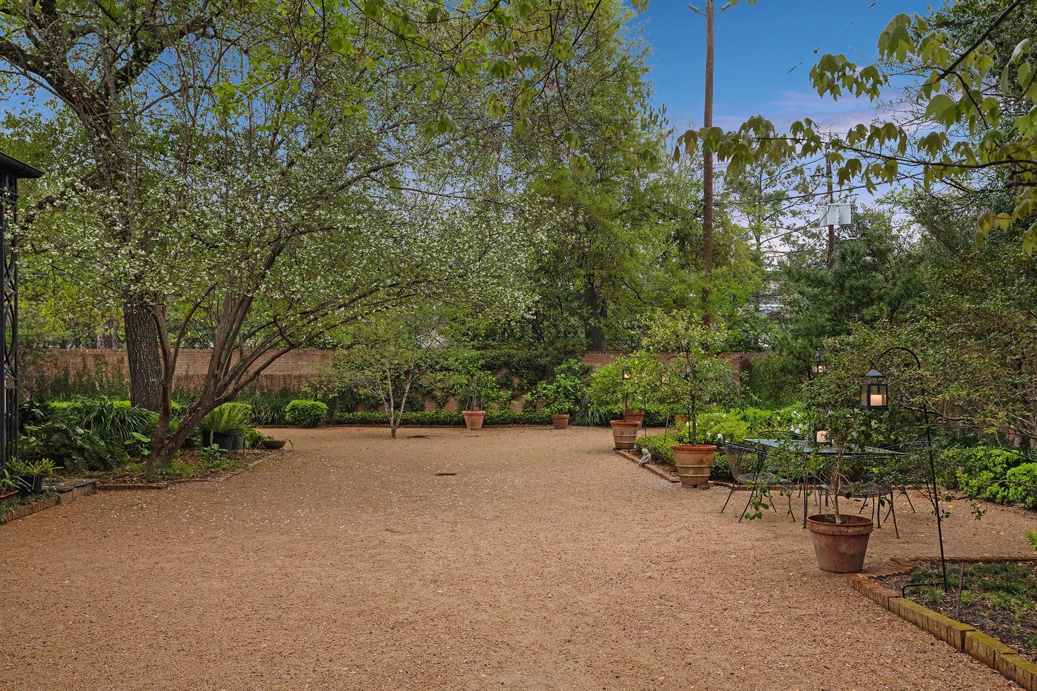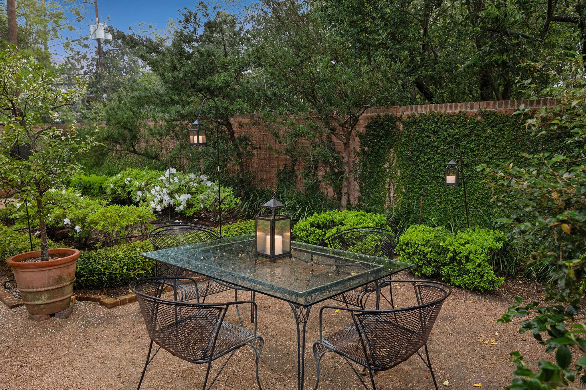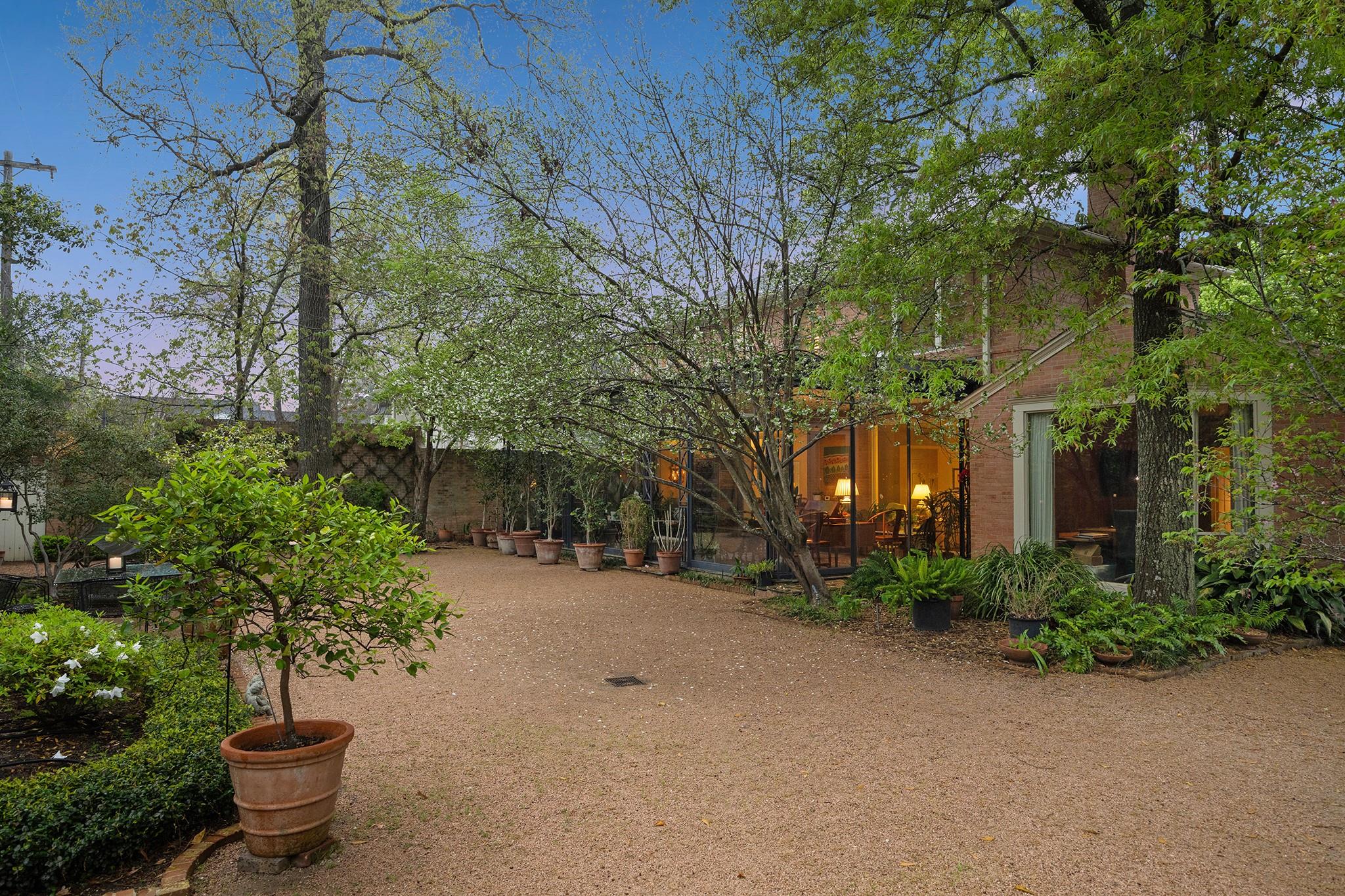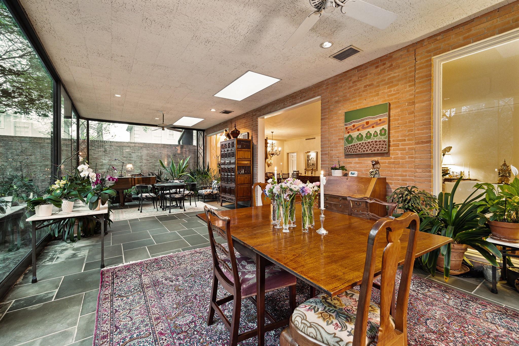 This River Oaks Mid Century Modern gem by renowned architect John F. Staub exudes timeless elegance. The expansive 19,095 sq. ft. corner lot (per HCAD) offers a welcoming parking court and lush private gardens. Lovingly restored and thoughtfully updated, this home blends classic charm with modern comforts. The open formal living and dining areas flow into a light-filled sunroom overlooking the gardens. A gracious wood-paneled study, complete with a cozy fireplace and bay window, adds sophistication. Notable features include stationary floor-to-ceiling picture windows, rich hardwood floors, solid bifold doors, and an imported marble fireplace. The first-floor primary suite is a true retreat, featuring a coffered ceiling, serene garden views, lavish dual full baths, and custom-fitted closets. Two secondary bedrooms with ensuite baths upstairs. The property backs onto the park-like gardens of the historic DeMenil House.