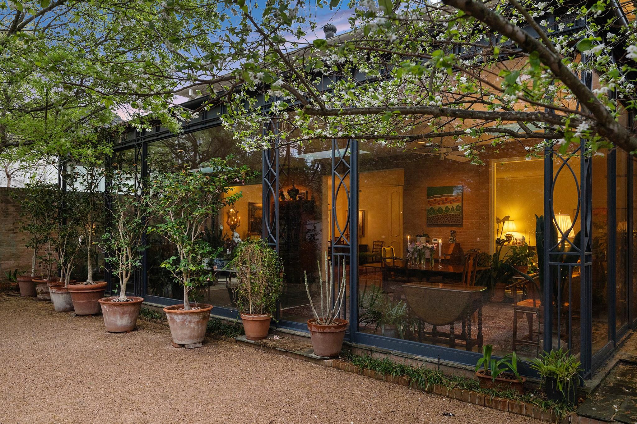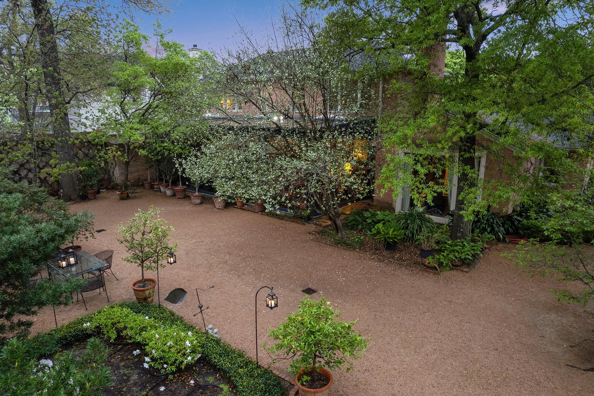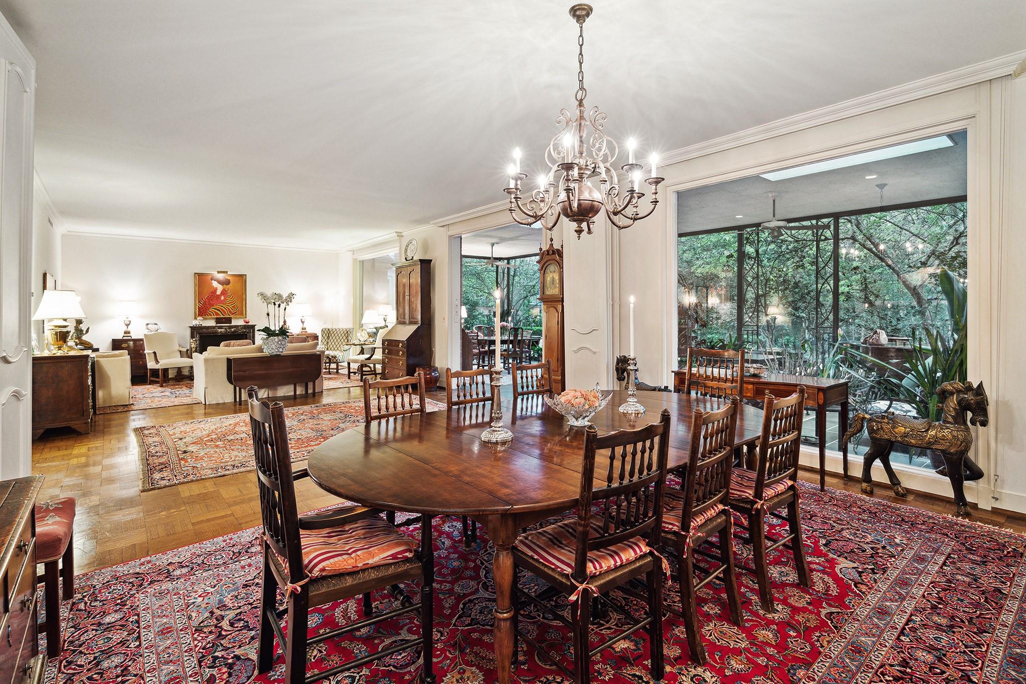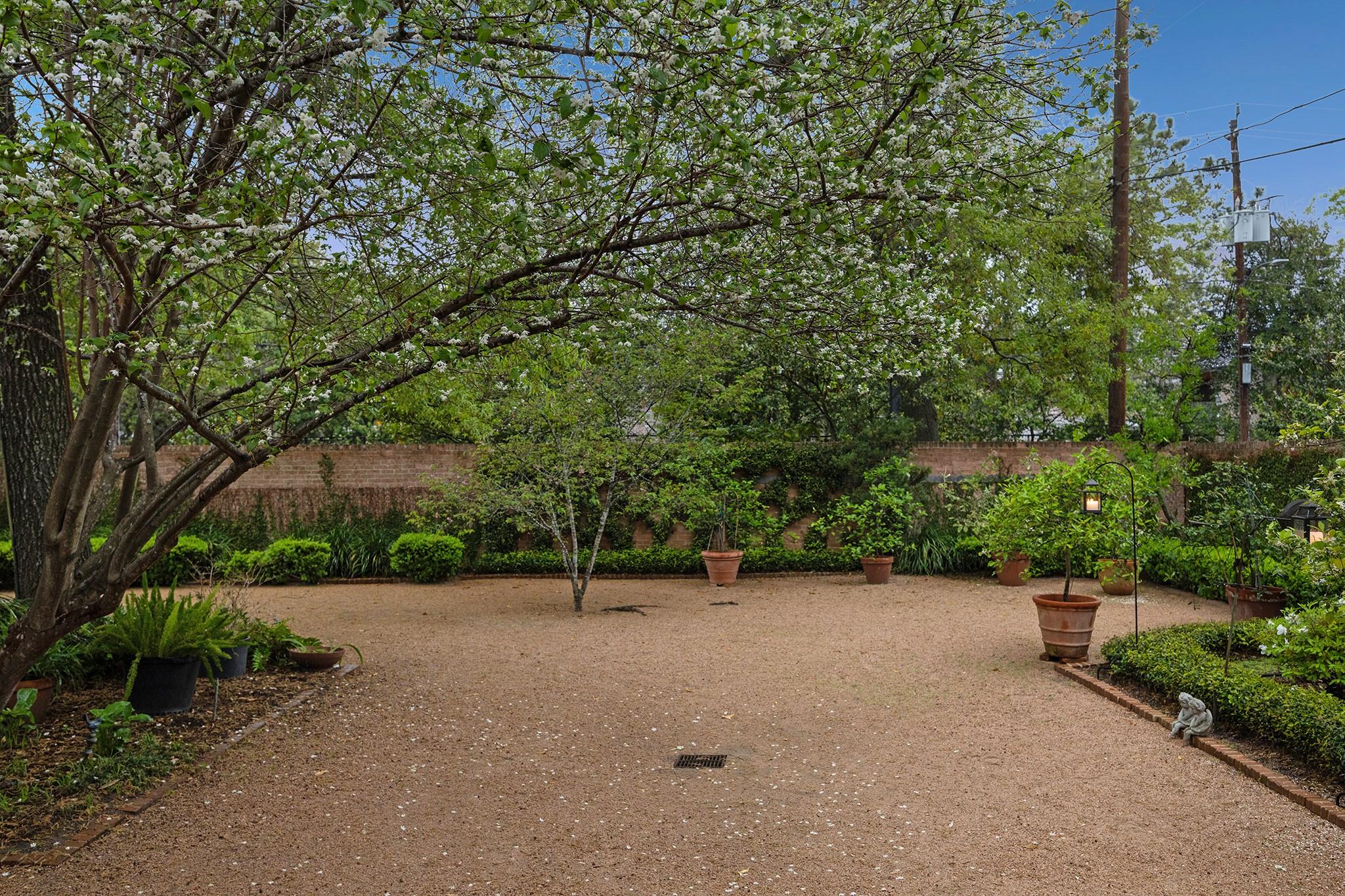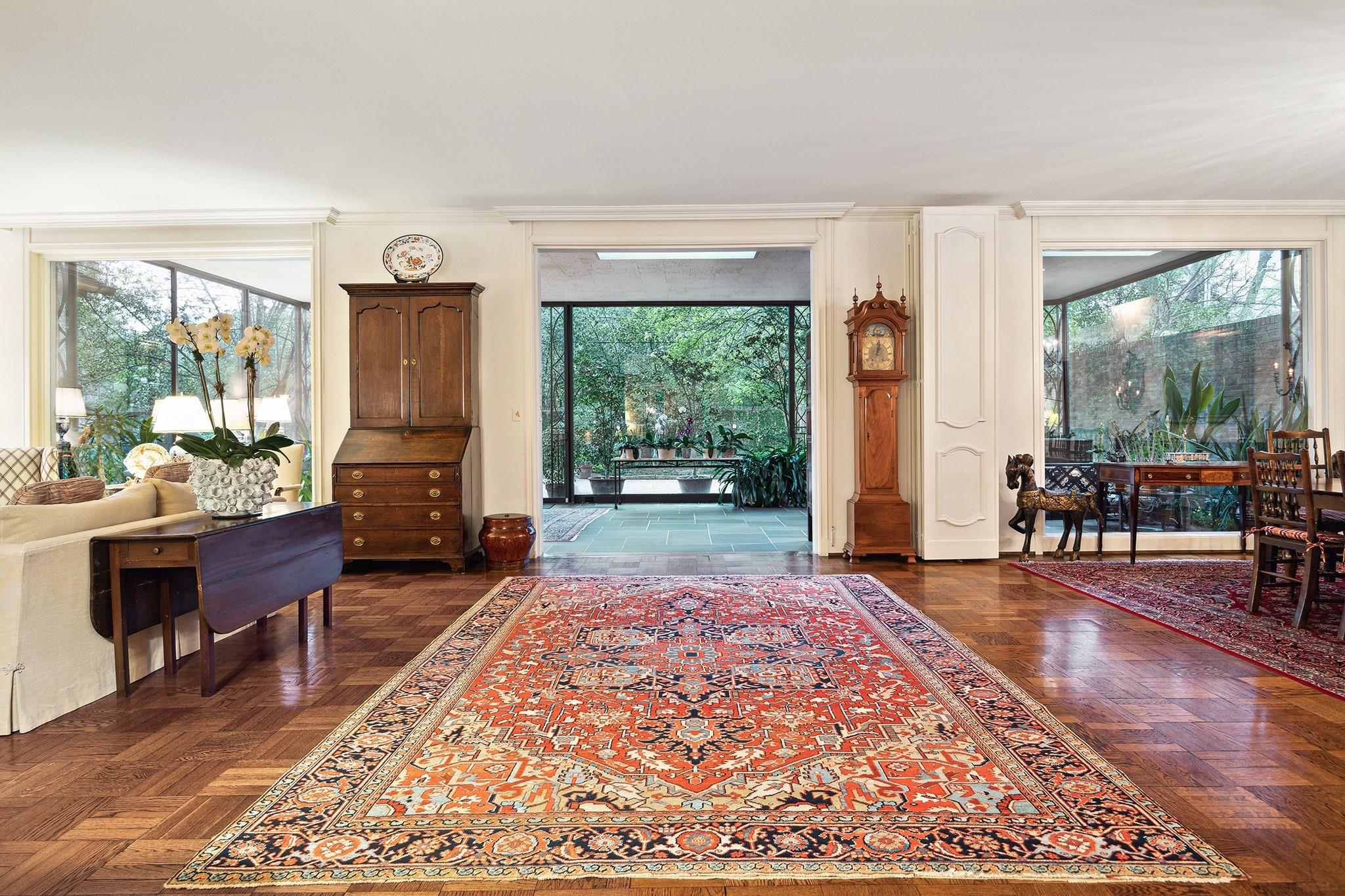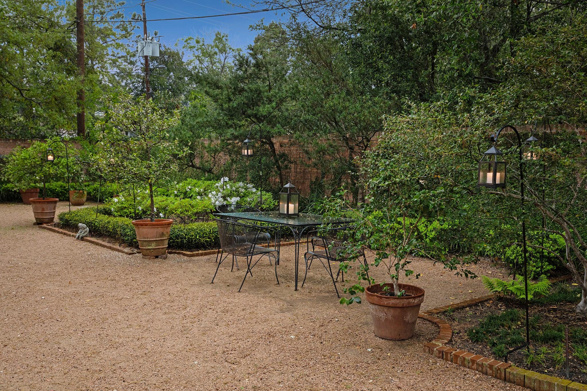 This River Oaks Mid Century Modern gem by renowned architect John F. Staub exudes timeless elegance. The expansive 19,095 sq. ft. corner lot (per HCAD) offers a welcoming parking court and lush private gardens. Lovingly restored and thoughtfully updated, this home blends classic charm with modern comforts. The open formal living and dining areas flow into a light-filled sunroom overlooking the gardens. A gracious wood-paneled study, complete with a cozy fireplace and bay window, adds sophistication. Notable features include stationary floor-to-ceiling picture windows, rich hardwood floors, solid bifold doors, and an imported marble fireplace. The first-floor primary suite is a true retreat, featuring a coffered ceiling, serene garden views, lavish dual full baths, and custom-fitted closets. Two secondary bedrooms with ensuite baths upstairs. The property backs onto the park-like gardens of the historic DeMenil House.