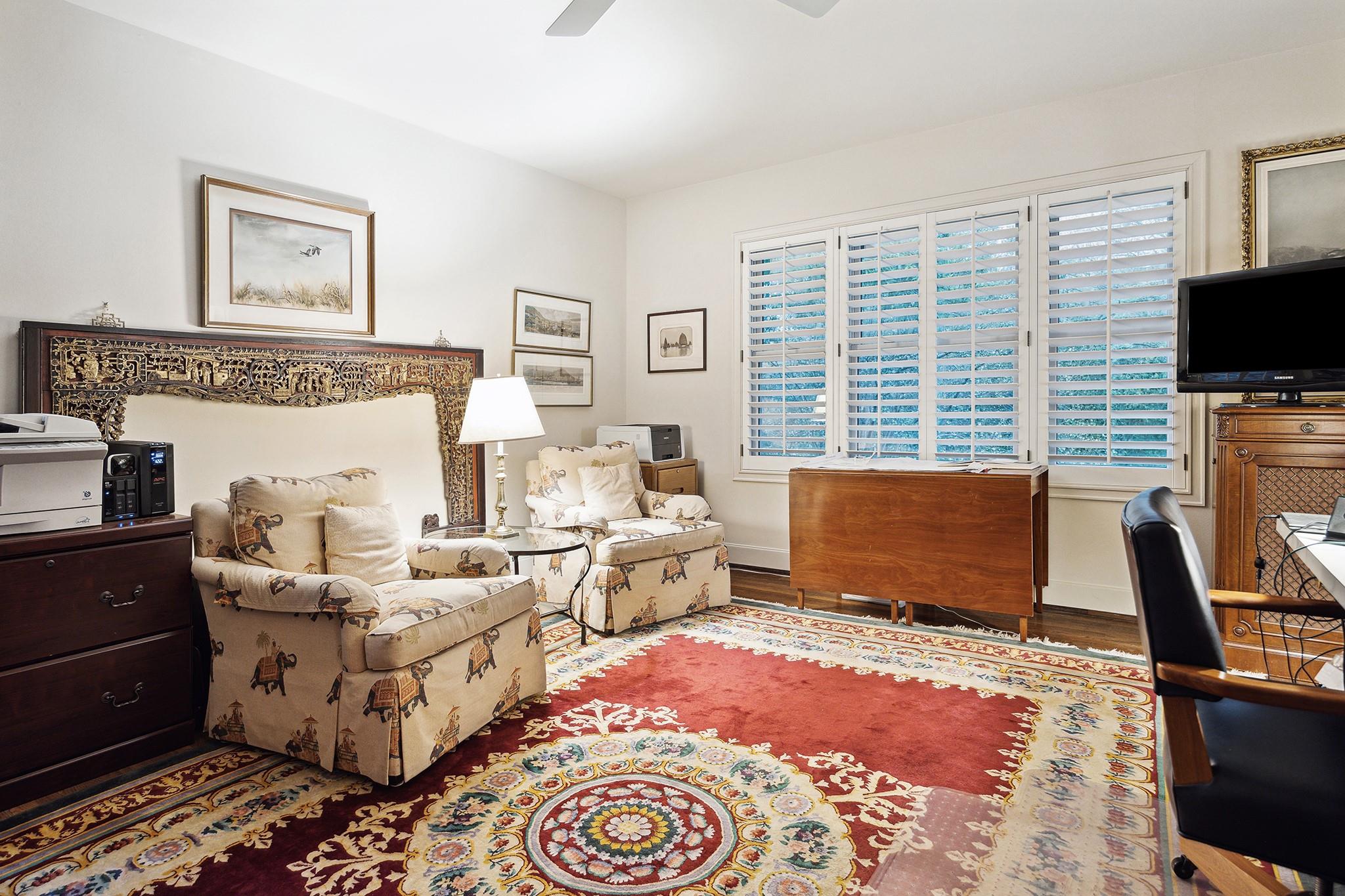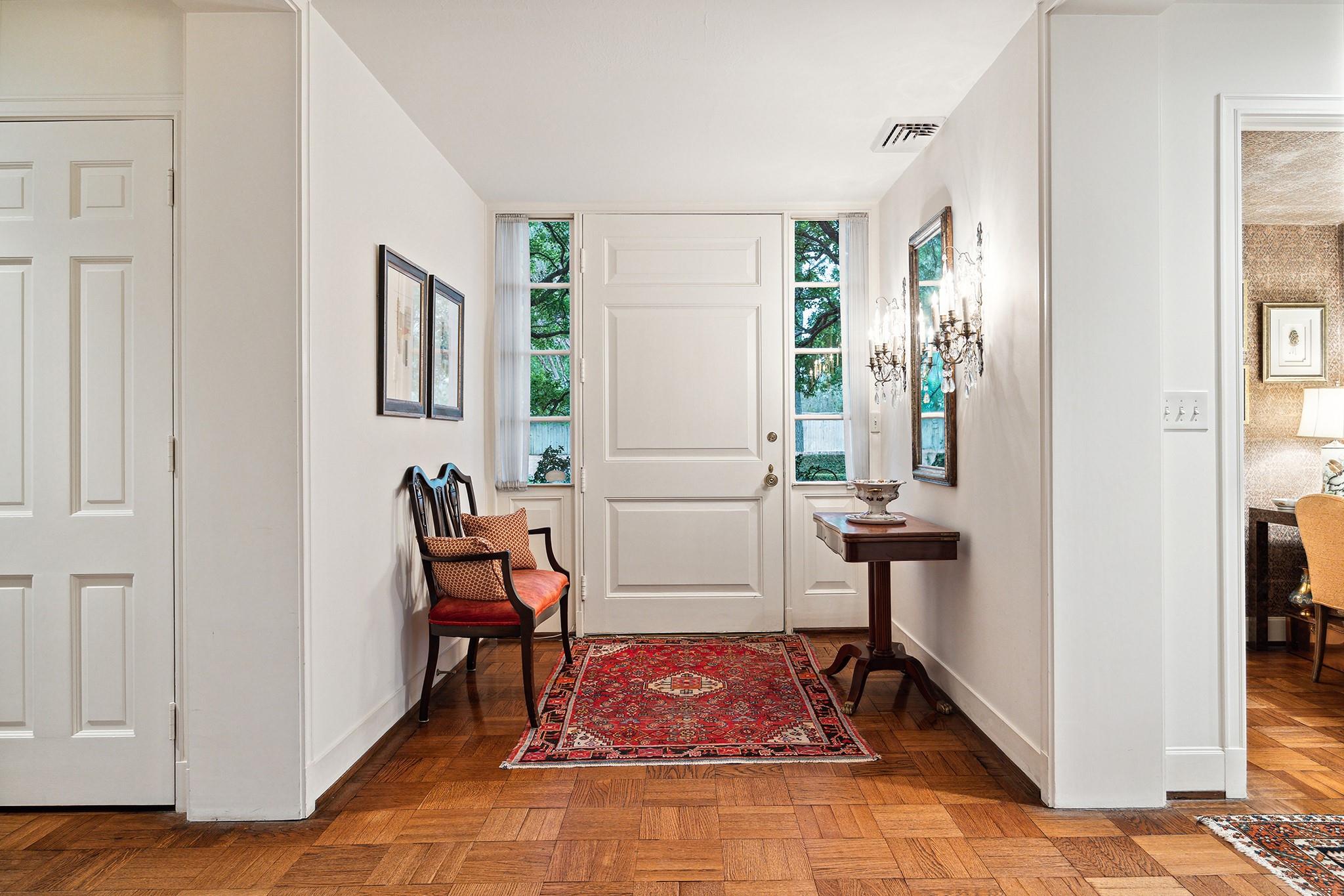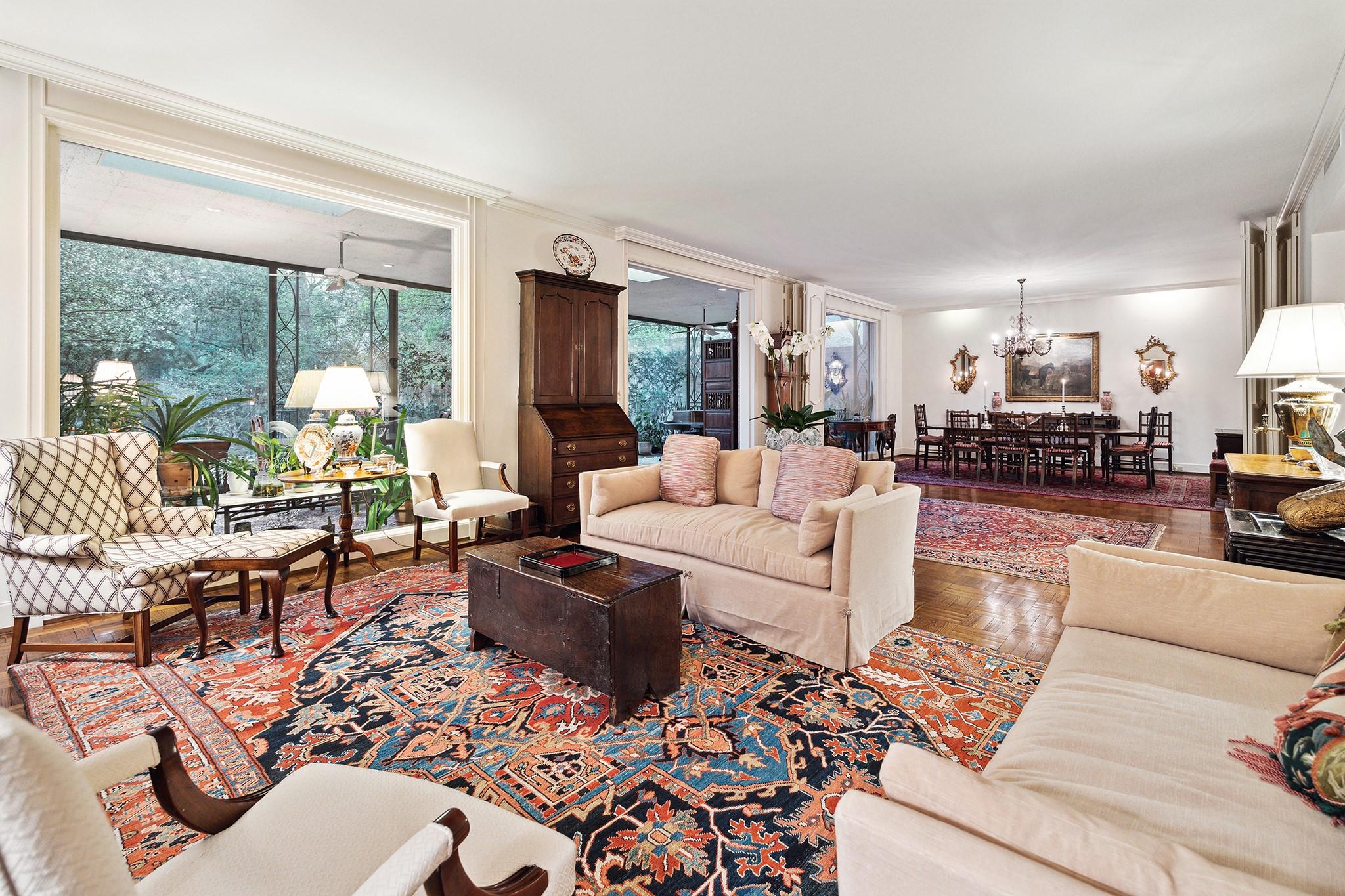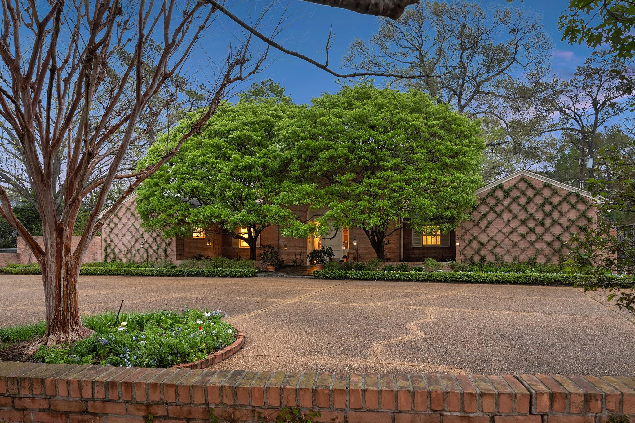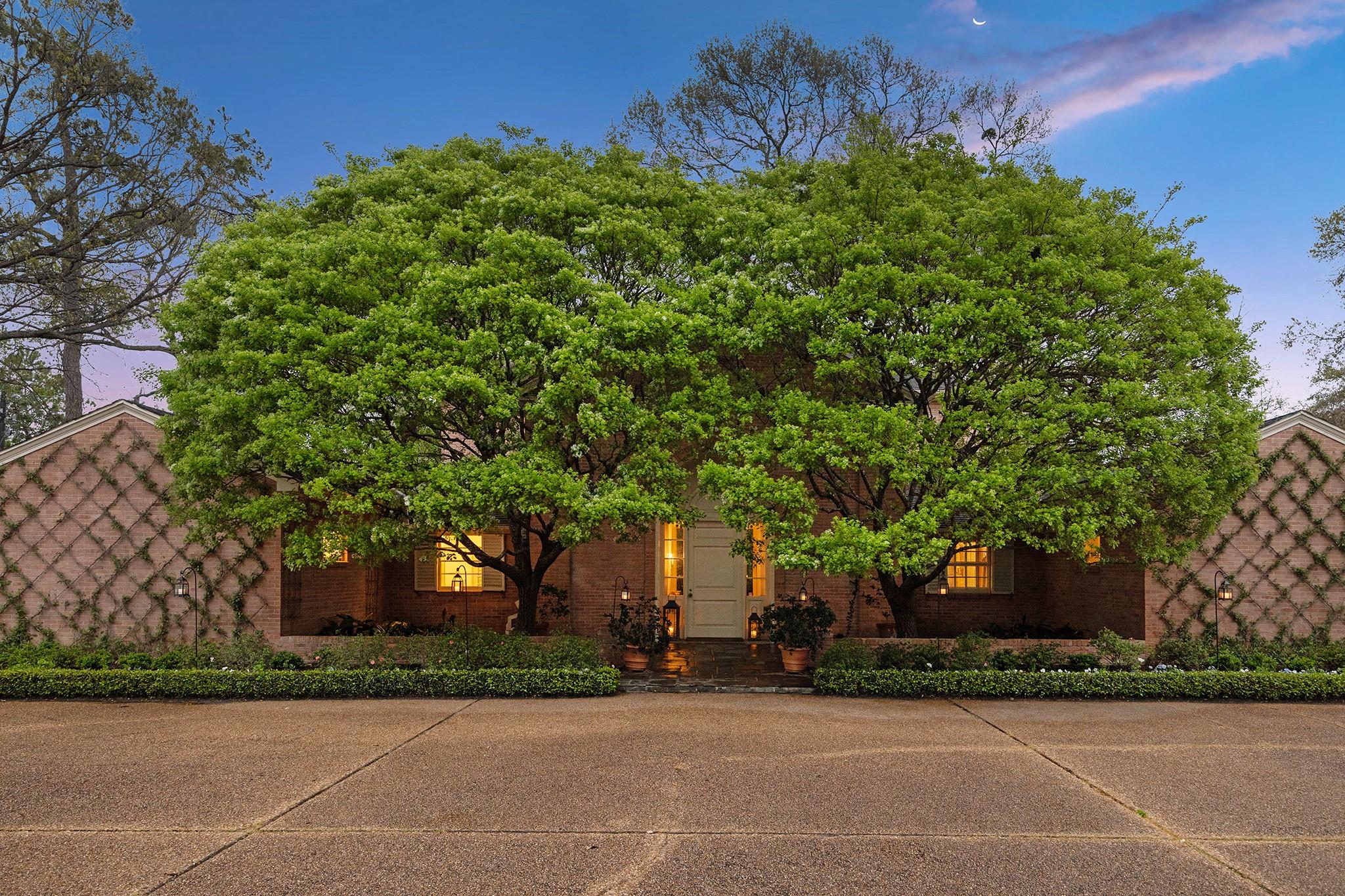 This River Oaks Mid Century Modern gem by renowned architect John F. Staub exudes timeless elegance. The expansive 19,095 sq. ft. corner lot (per HCAD) offers a welcoming parking court and lush private gardens. Lovingly restored and thoughtfully updated, this home blends classic charm with modern comforts. The open formal living and dining areas flow into a light-filled sunroom overlooking the gardens. A gracious wood-paneled study, complete with a cozy fireplace and bay window, adds sophistication. Notable features include stationary floor-to-ceiling picture windows, rich hardwood floors, solid bifold doors, and an imported marble fireplace. The first-floor primary suite is a true retreat, featuring a coffered ceiling, serene garden views, lavish dual full baths, and custom-fitted closets. Two secondary bedrooms with ensuite baths upstairs. The property backs onto the park-like gardens of the historic DeMenil House.