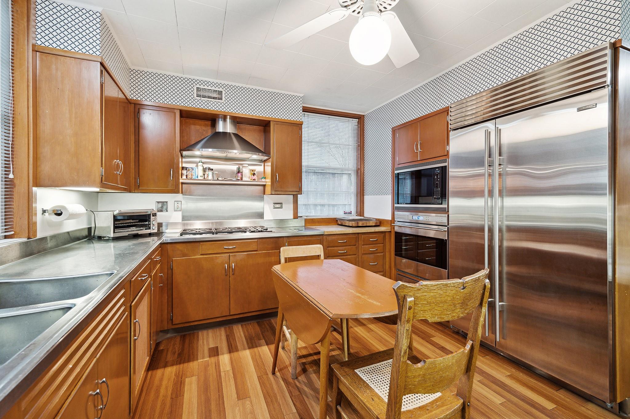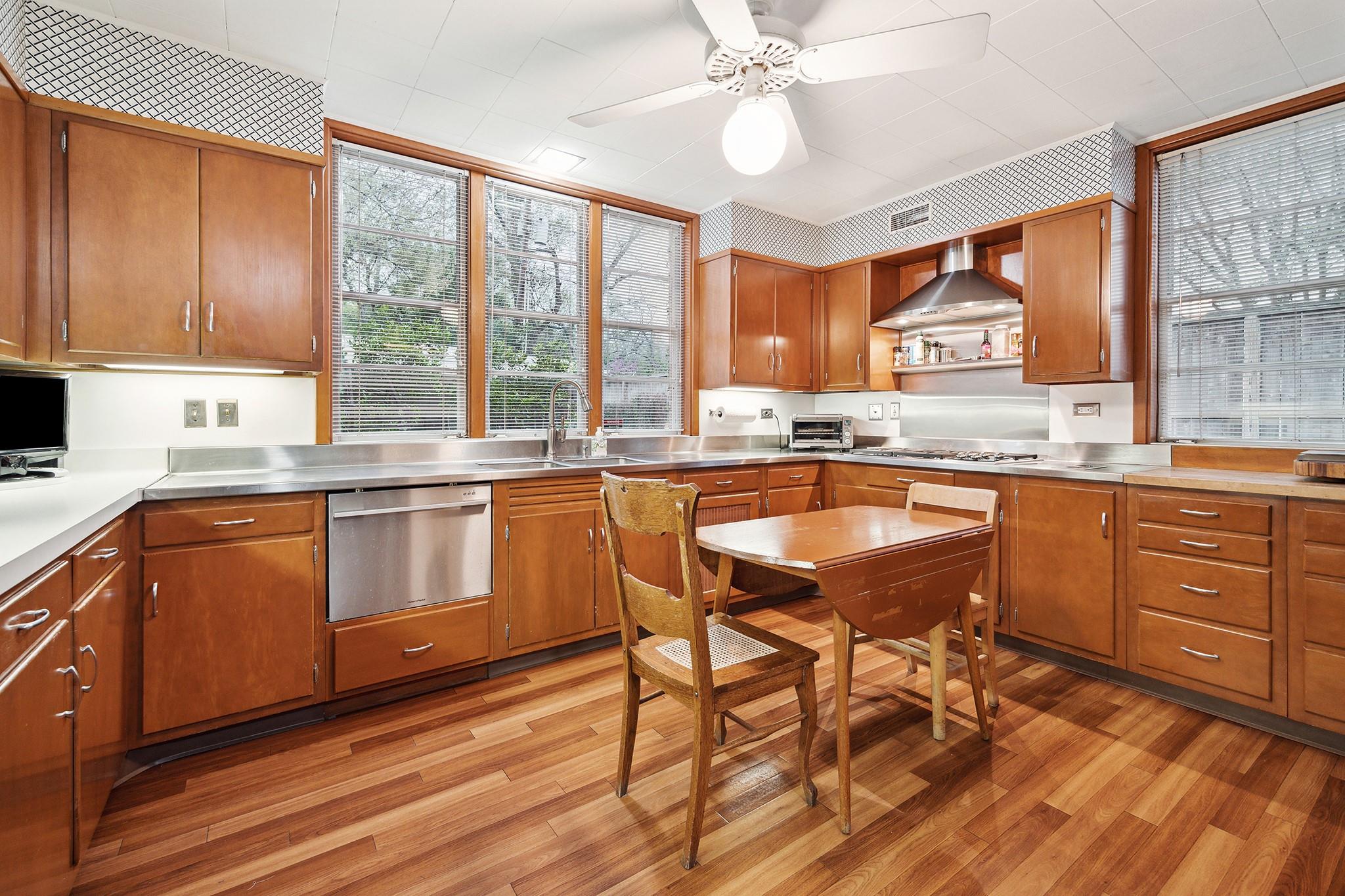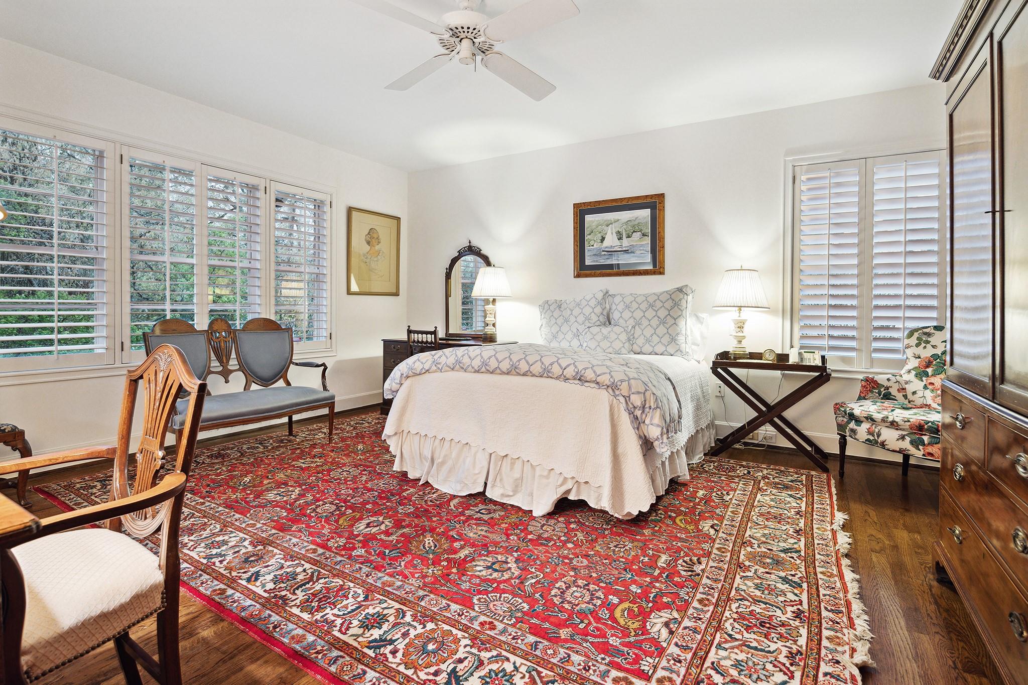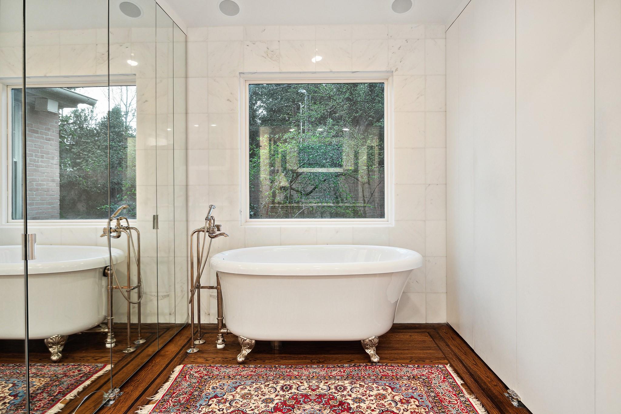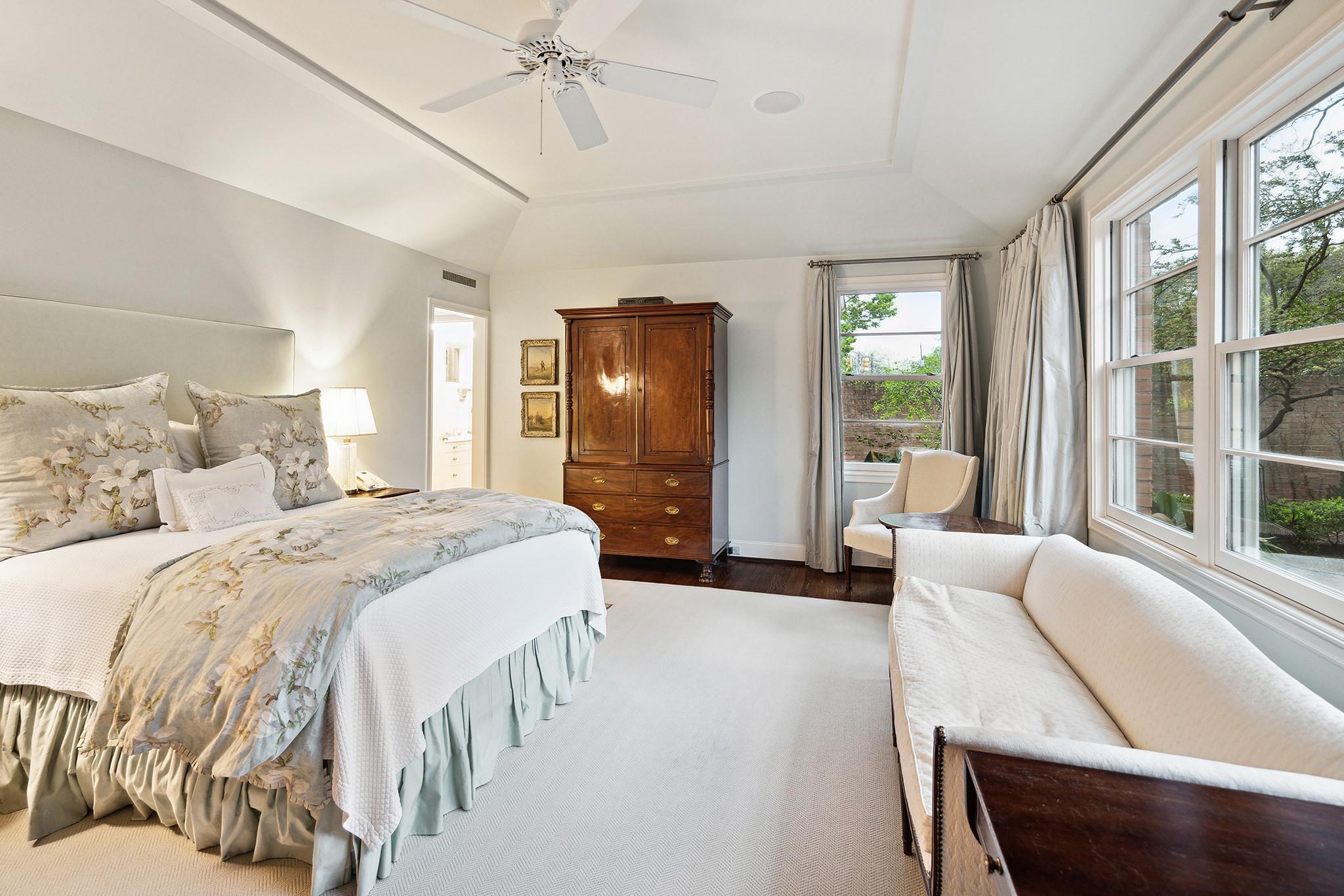 This River Oaks Mid Century Modern gem by renowned architect John F. Staub exudes timeless elegance. The expansive 19,095 sq. ft. corner lot (per HCAD) offers a welcoming parking court and lush private gardens. Lovingly restored and thoughtfully updated, this home blends classic charm with modern comforts. The open formal living and dining areas flow into a light-filled sunroom overlooking the gardens. A gracious wood-paneled study, complete with a cozy fireplace and bay window, adds sophistication. Notable features include stationary floor-to-ceiling picture windows, rich hardwood floors, solid bifold doors, and an imported marble fireplace. The first-floor primary suite is a true retreat, featuring a coffered ceiling, serene garden views, lavish dual full baths, and custom-fitted closets. Two secondary bedrooms with ensuite baths upstairs. The property backs onto the park-like gardens of the historic DeMenil House.