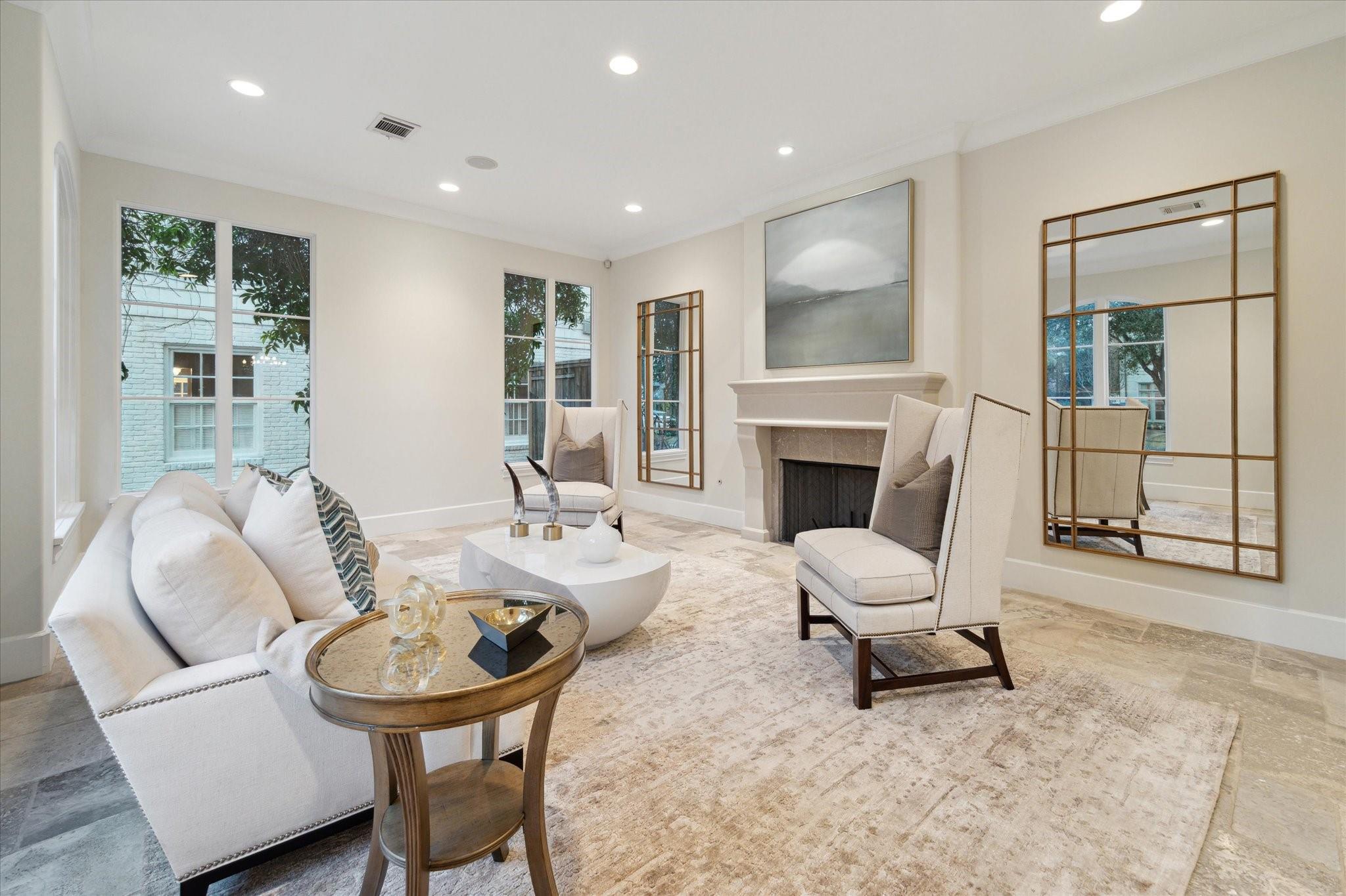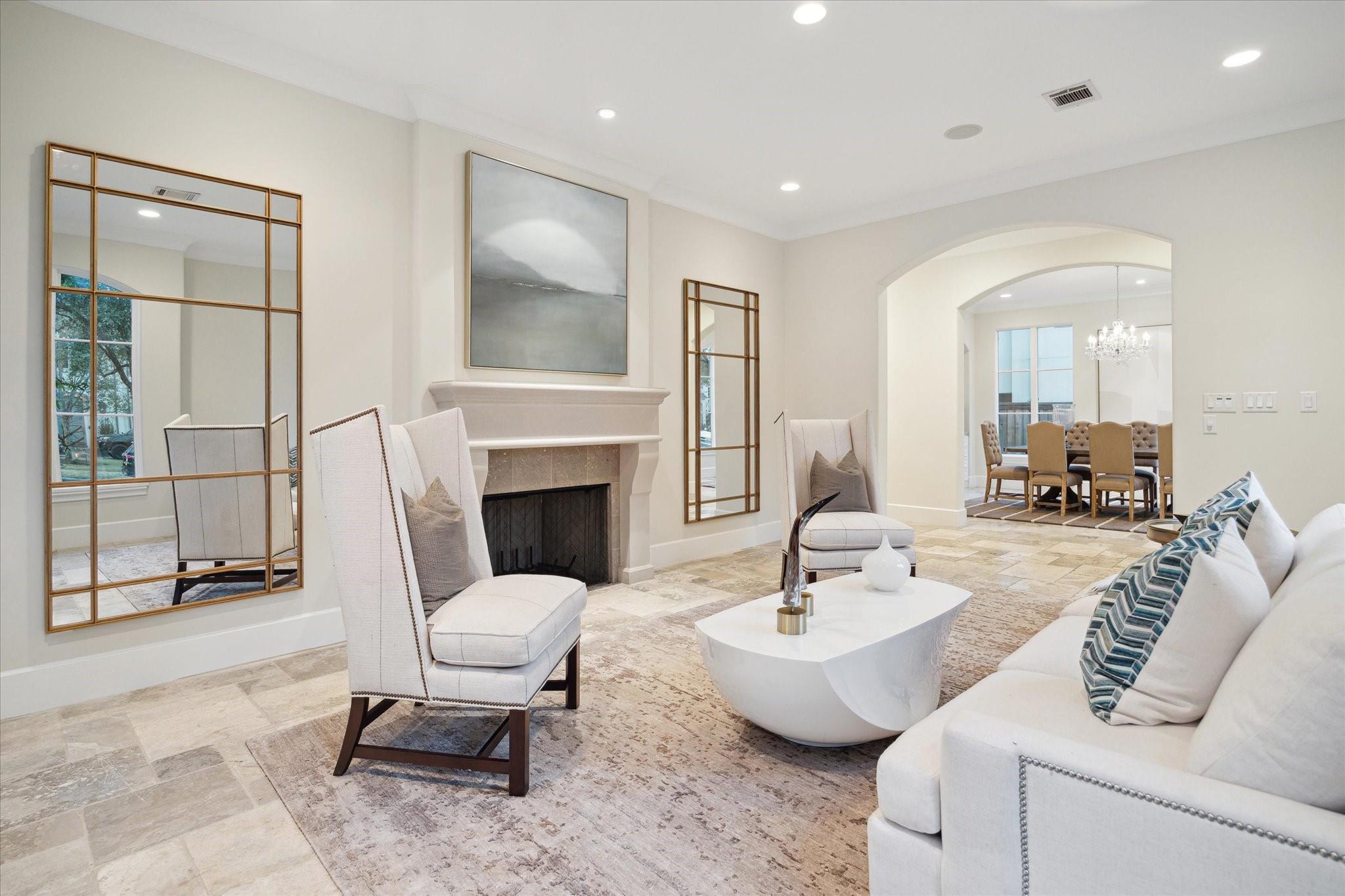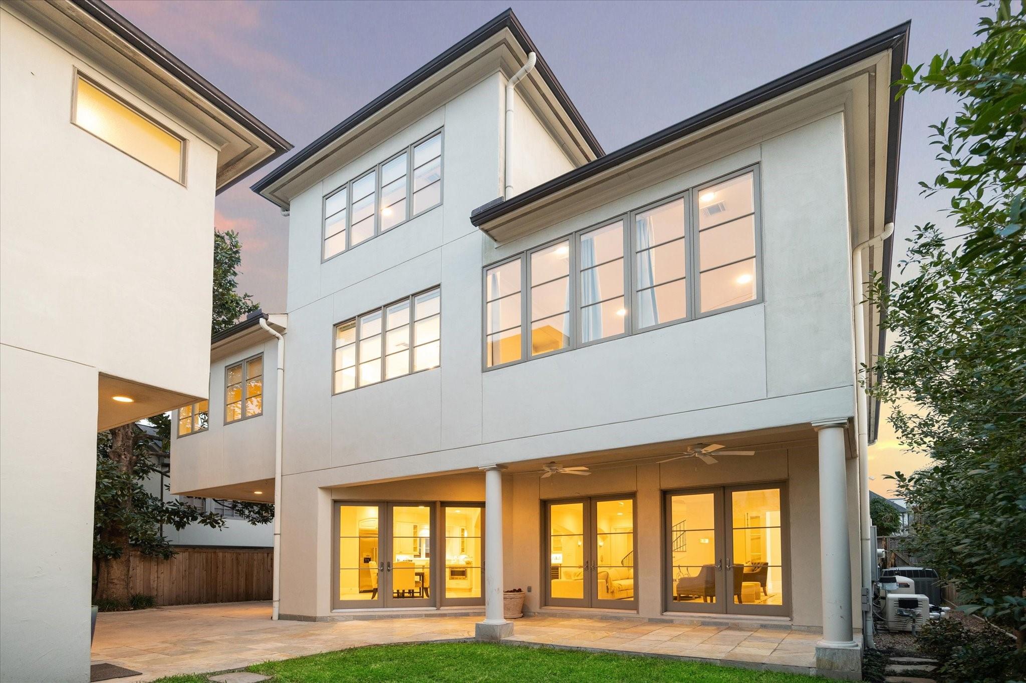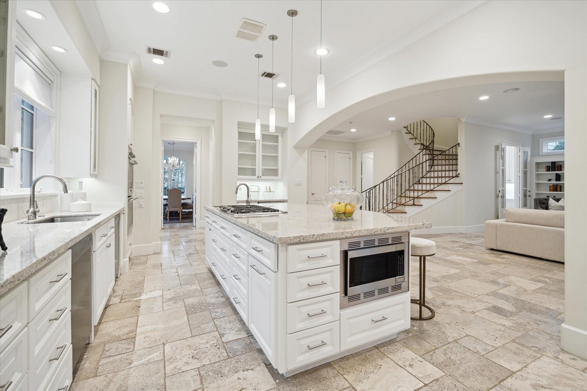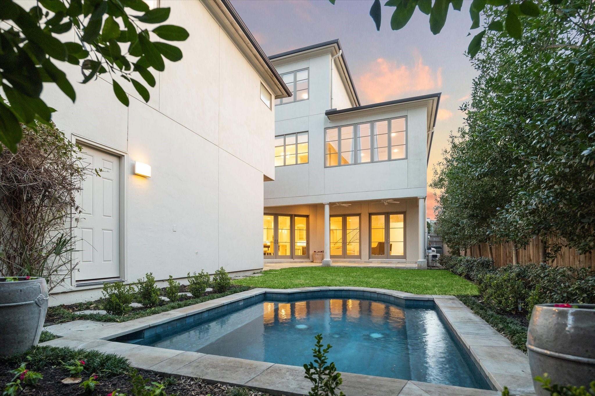 This Avalon/River Oaks home, custom-built by Bardwell, blends timeless design with traditional and contemporary elements. It features crown moldings, tumbled travertine floors, 10' ceilings, en-suite baths, and light-filled rooms. The gracious entry foyer is flanked by formal living and dining rooms, leading to an open kitchen and family room. The kitchen boasts a large granite island, Thermador gas cooktop, dual ovens, and dual Asko dishwashers. Private office is downstairs and there is space for an elevator. Upstairs, the primary suite, three secondary bedrooms, and a bedroom/study await. All bedrooms enjoy spacious closets. The third floor offers a potential bedroom or game room with a full bath. A separate garage apartment includes a kitchen/living area, bedroom, and bath. The covered back porch overlooks a landscaped backyard with a small heated pool, pool bath accessible from outdoors, and green space. Located within walking distance to schools, fine restaurants, and shopping.